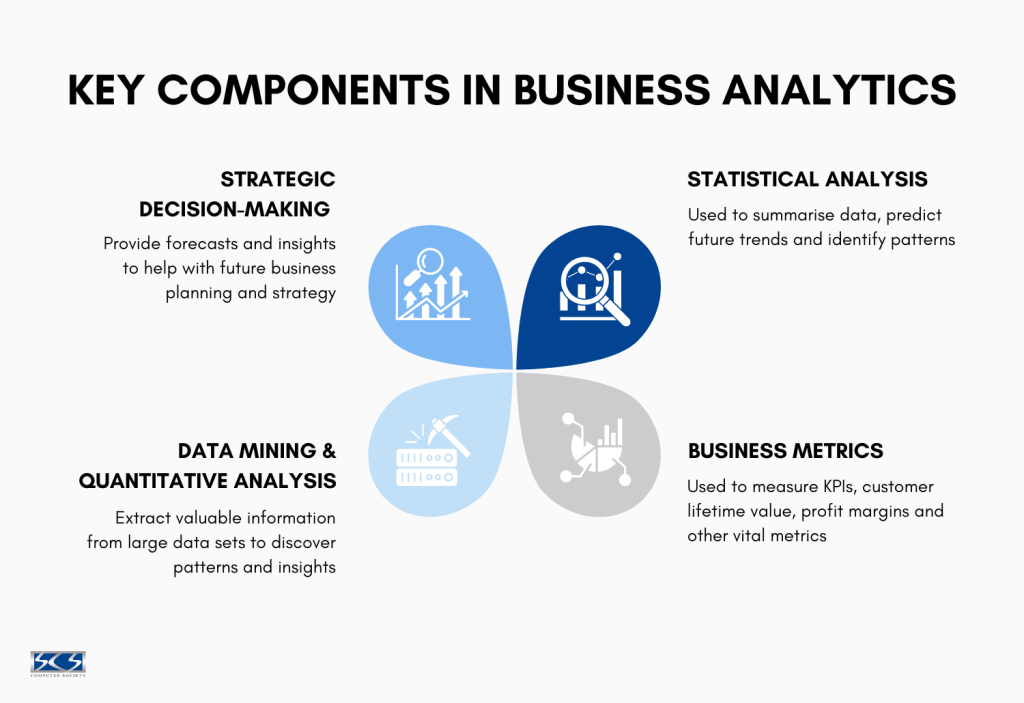 The applications of business analytics are vast and varied, ranging from optimising supply chain management to forecasting market trends. Companies use business analytics to enhance resource allocation, improve operational efficiency, and increase market responsiveness.