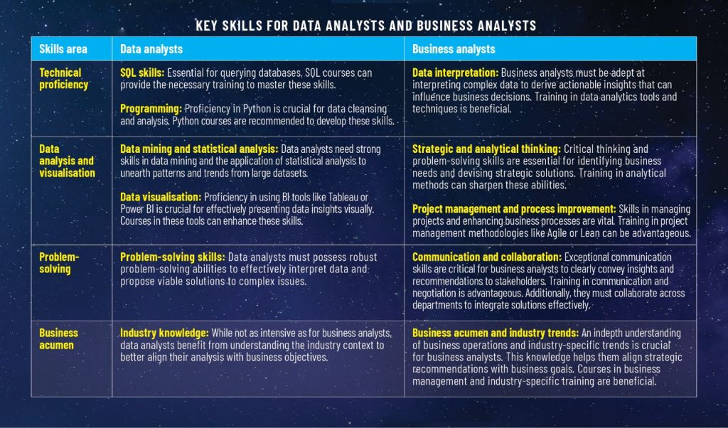 Conversely, if you’re drawn towards strategic decision-making and overseeing projects, a role as a business analyst might suit you better. Business analysts thrive in environments where they can use data to make strategic decisions that align with business objectives. They thrive in an environment where they can fully apply technical skills deeply in a domain to see through a business strategy outcome. On top of that, they often serve as a bridge between IT and the rest of the business, ensuring that data solutions meet business needs.