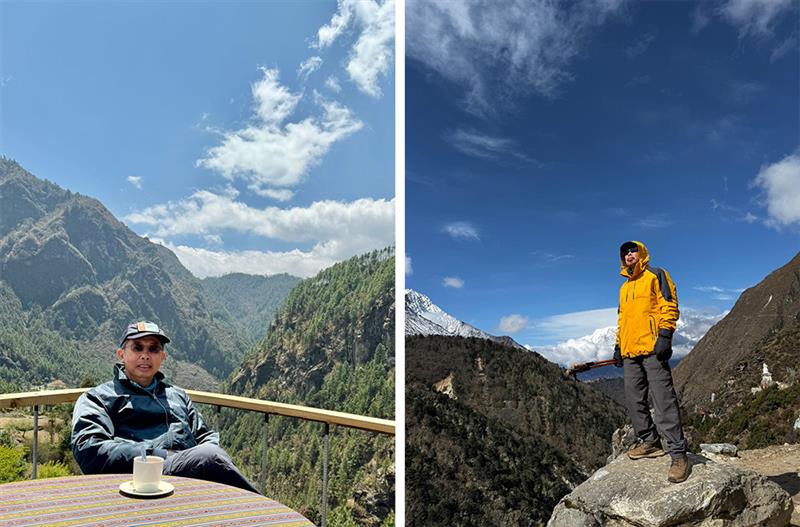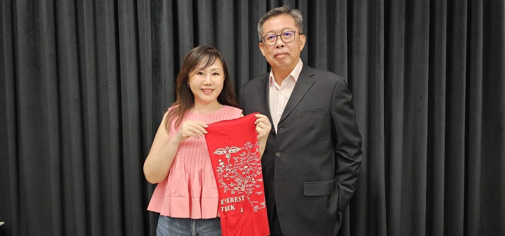 Amos Ng, Chief Financial Officer, Straco Corporation Limited, gifted the podcast host, Pauline Chee of ISCA, a bandana depicting his Mount Everest trekking route.