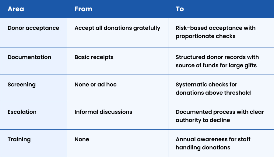 As auditors: Go beyond financial statement audits to assess governance controls. Flag gaps in donor due diligence. Recommend practical improvements suited to the charity’s scale.