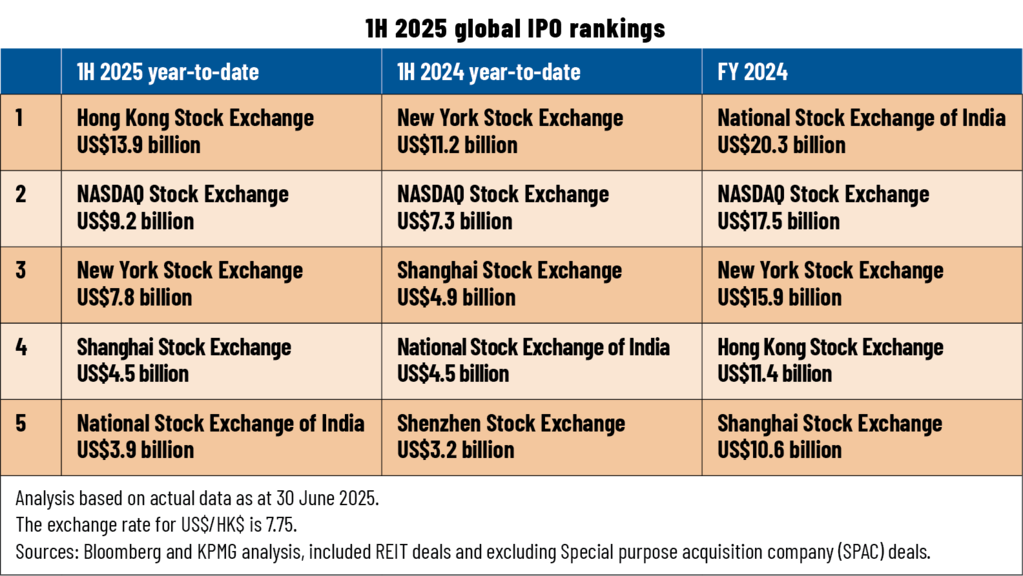 Global IPO markets raised a total of US$60.9 billion across 544 deals in 1H 2025. Overall results were stable compared to 1H 2024, as total funds raised increased by 5% while deal volume fell 6%. NASDAQ Stock Exchange and New York Stock Exchange ranked second and third after Hong Kong Stock Exchange, with an 8% decrease in combined fundraising year-on-year; Shanghai Stock Exchange and National Stock Exchange of India ranked fourth and fifth, respectively.