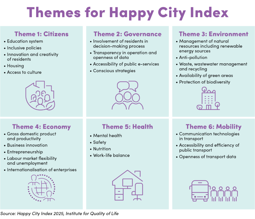 In an increasingly uncertain and volatile world, how happy its citizens are is a useful metric to inform a government in its policymaking. Given that what makes one happy will differ from person to person, the Happy City Index, by think tank Institute for Quality of Life, injects a degree of objectivity into a city’s development by examining 82 indicators across 26 areas of activity. The findings are intended to equip leaders, planners and stakeholders with the requisite tools and strategies to implement effective and sustainable solutions for enhancing well-being.