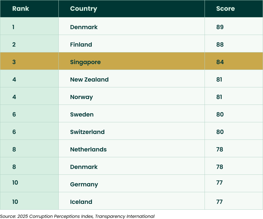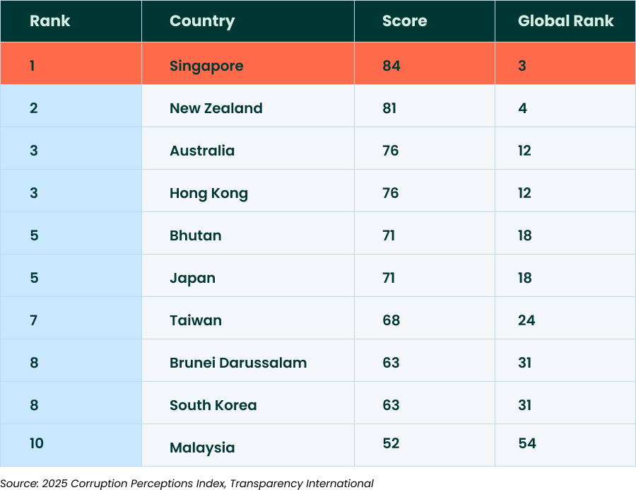 Singapore has retained its top position as the least corrupt nation in Asia Pacific, according to the latest 2025 Corruption Perceptions Index (CPI) report by Transparency International. With a score of 84 out of 100, Singapore is ahead of New Zealand (score: 81) in second place, and Australia (score: 76) in third, regionally.