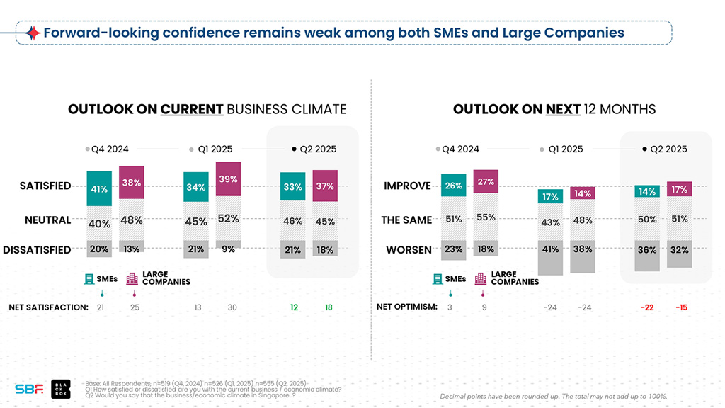 The survey, administered quarterly, was carried out from June 25 to July 18. It drew responses from 555 businesses across all key industries. The sample included both small and medium-sized enterprises (SMEs), comprising 85%, and large companies, making up the balance 15%. The ratio largely mirrors SBF’s membership base.