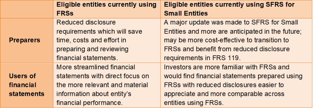 The first group of Singapore-incorporated companies identified to be able to benefit from a set of reduced disclosure requirements in FRSs were those currently using SFRS for Small Entities. In 2025, IASB issued a major update to the IFRS for SMEs Accounting Standard to enhance alignment with full IFRS Accounting Standards, effective for annual reporting periods beginning on or after 1 January 2027. A similar update was issued by ASC to SFRS for Small Entities to mirror the alignment to full FRSs. It may be more cost-effective in the longer term for these companies to transition to FRSs before 2027 and benefit from reduced disclosure requirements rather than incurring time and effort to assess the implications of the new and amended requirements in this major update, especially since future updates to SFRS for Small Entities are expected to introduce requirements that would be more closely aligned with those of full FRSs.