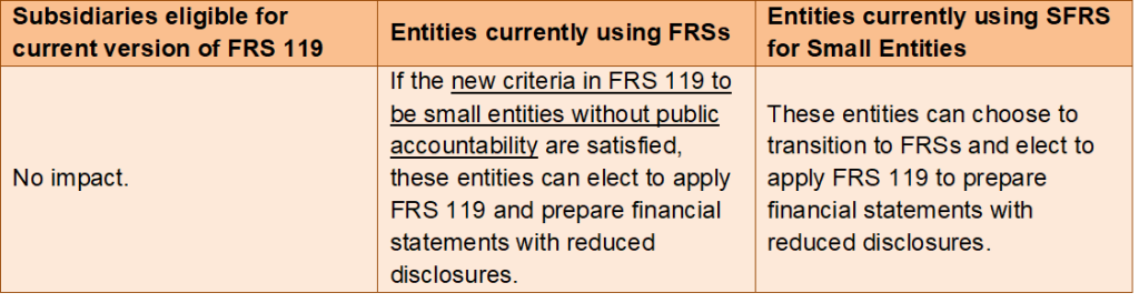 In August 2025, ASC amended the title of FRS 119 to Subsidiaries and Small Entities without Public Accountability: Disclosures, and made it available as an option to Singapore entities that prepare their financial statements in accordance with FRSs and fulfil the criteria to be small entities without public accountability. The amended FRS 119 is effective for annual reporting periods beginning on or after 1 January 2027, with earlier application permitted.